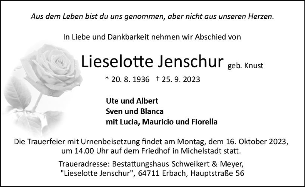 Hier finden Sie alle Traueranzeigen aus der Zeitung, die bisher für Lieselotte Jenschur erschienen sind. Weitere Traueranzeigen, die in der Zeitung erscheinen, werden hier ebenfalls aufgelistet