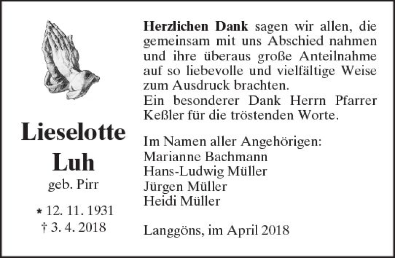 Hier finden Sie alle Traueranzeigen aus der Zeitung, die bisher für Lieselotte Luh erschienen sind. Weitere Traueranzeigen, die in der Zeitung erscheinen, werden hier ebenfalls aufgelistet