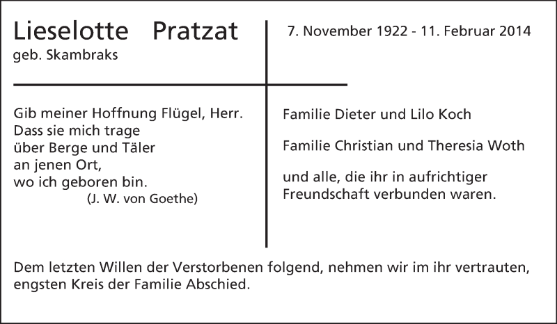 Hier finden Sie alle Traueranzeigen aus der Zeitung, die bisher für Lieselotte Pratzat erschienen sind. Weitere Traueranzeigen, die in der Zeitung erscheinen, werden hier ebenfalls aufgelistet