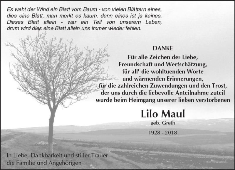 Hier finden Sie alle Traueranzeigen aus der Zeitung, die bisher für Lilo Maul erschienen sind. Weitere Traueranzeigen, die in der Zeitung erscheinen, werden hier ebenfalls aufgelistet
