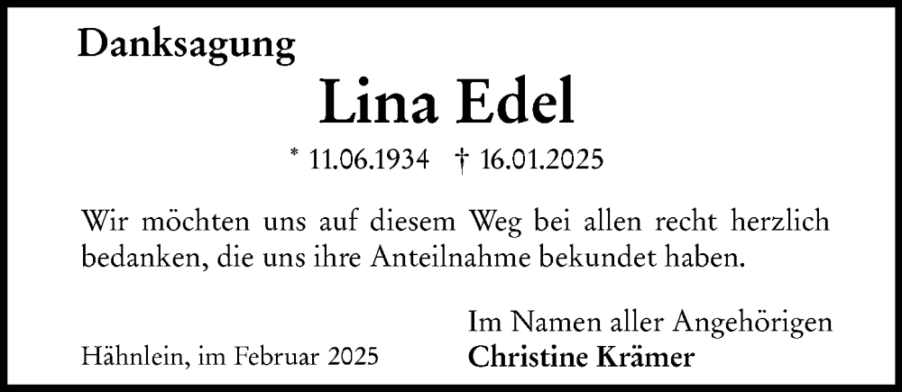 Hier finden Sie alle Traueranzeigen aus der Zeitung, die bisher für Lina Edel erschienen sind. Weitere Traueranzeigen, die in der Zeitung erscheinen, werden hier ebenfalls aufgelistet