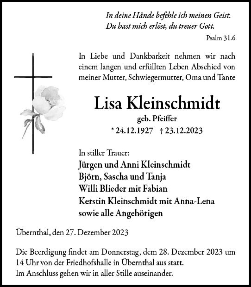 Hier finden Sie alle Traueranzeigen aus der Zeitung, die bisher für Lisa Kleinschmidt erschienen sind. Weitere Traueranzeigen, die in der Zeitung erscheinen, werden hier ebenfalls aufgelistet