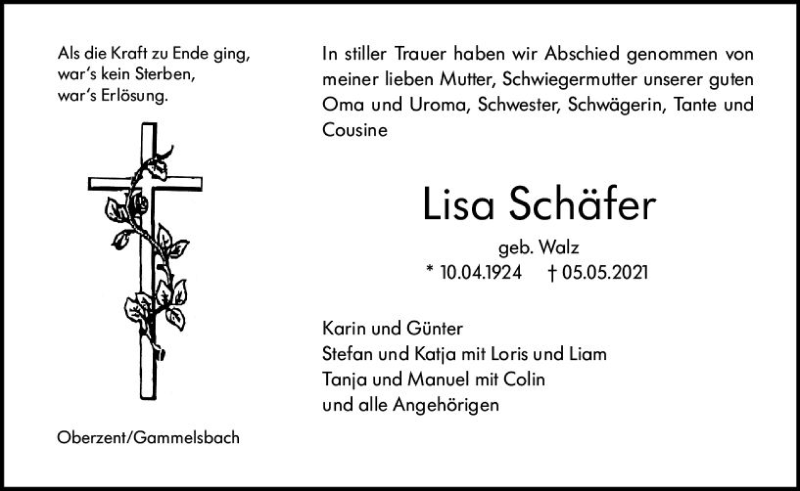 Hier finden Sie alle Traueranzeigen aus der Zeitung, die bisher für Lisa Schäfer erschienen sind. Weitere Traueranzeigen, die in der Zeitung erscheinen, werden hier ebenfalls aufgelistet