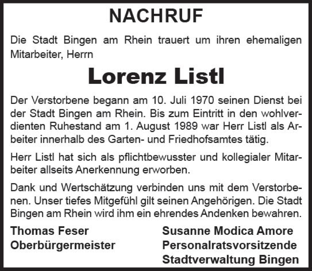 Hier finden Sie alle Traueranzeigen aus der Zeitung, die bisher für Lorenz Listl erschienen sind. Weitere Traueranzeigen, die in der Zeitung erscheinen, werden hier ebenfalls aufgelistet