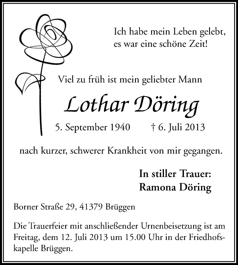 Hier finden Sie alle Traueranzeigen aus der Zeitung, die bisher für Lothar Döring erschienen sind. Weitere Traueranzeigen, die in der Zeitung erscheinen, werden hier ebenfalls aufgelistet