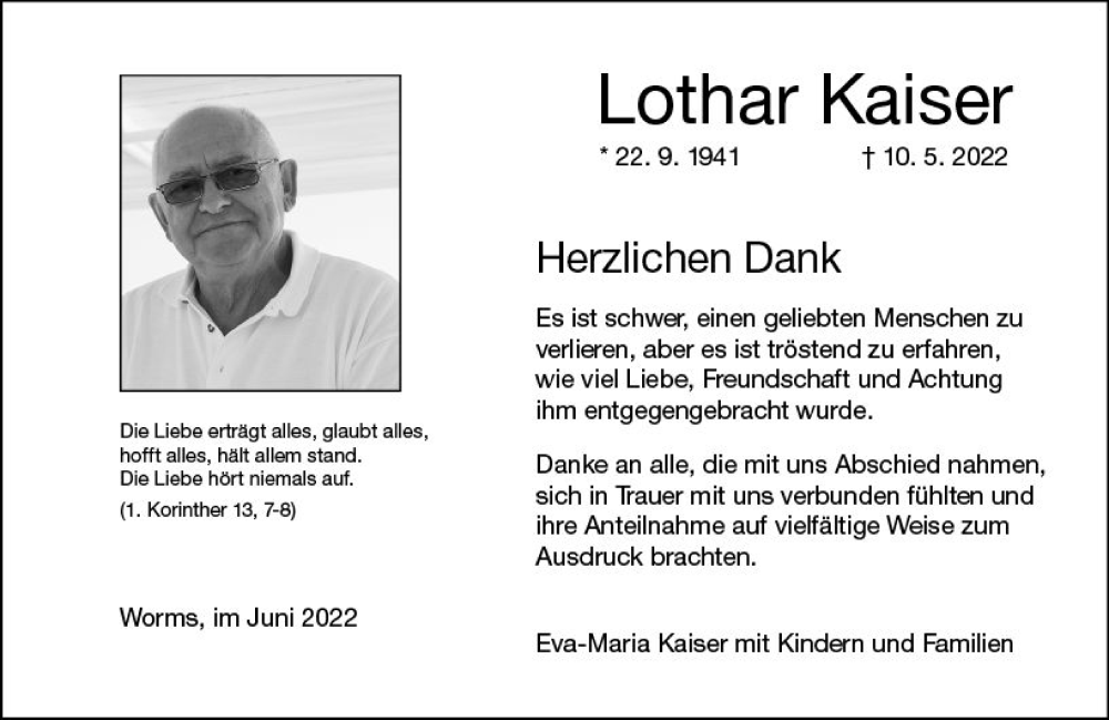 Hier finden Sie alle Traueranzeigen aus der Zeitung, die bisher für Lothar Kaiser erschienen sind. Weitere Traueranzeigen, die in der Zeitung erscheinen, werden hier ebenfalls aufgelistet