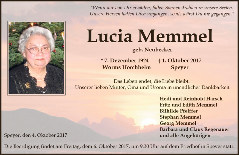 Hier finden Sie alle Traueranzeigen aus der Zeitung, die bisher für Lucia Memmel erschienen sind. Weitere Traueranzeigen, die in der Zeitung erscheinen, werden hier ebenfalls aufgelistet