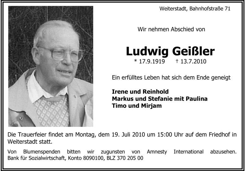 Hier finden Sie alle Traueranzeigen aus der Zeitung, die bisher für Ludwig Geißler erschienen sind. Weitere Traueranzeigen, die in der Zeitung erscheinen, werden hier ebenfalls aufgelistet