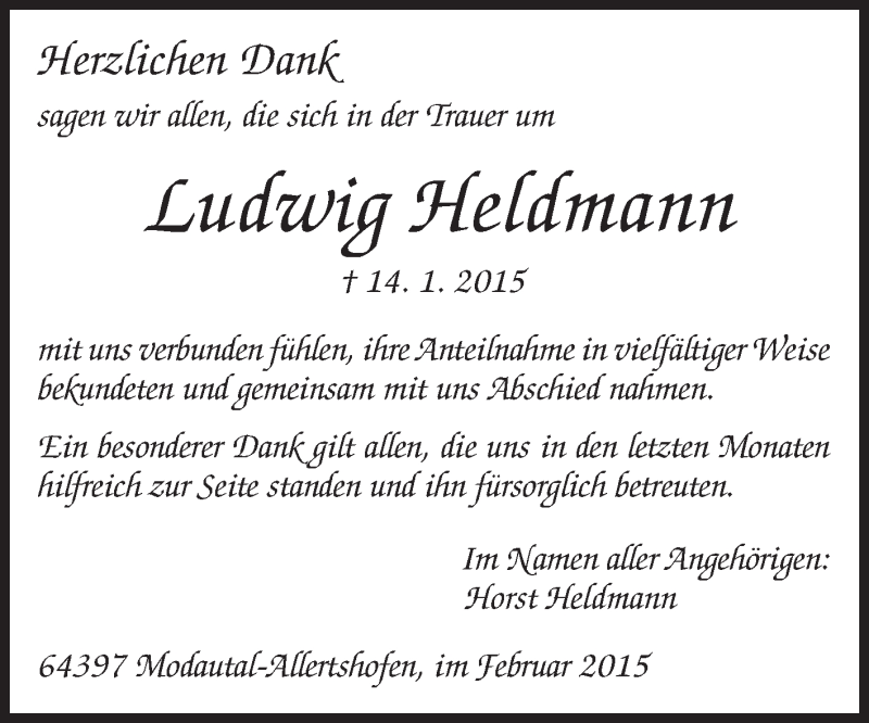 Hier finden Sie alle Traueranzeigen aus der Zeitung, die bisher für Ludwig Heldmann erschienen sind. Weitere Traueranzeigen, die in der Zeitung erscheinen, werden hier ebenfalls aufgelistet