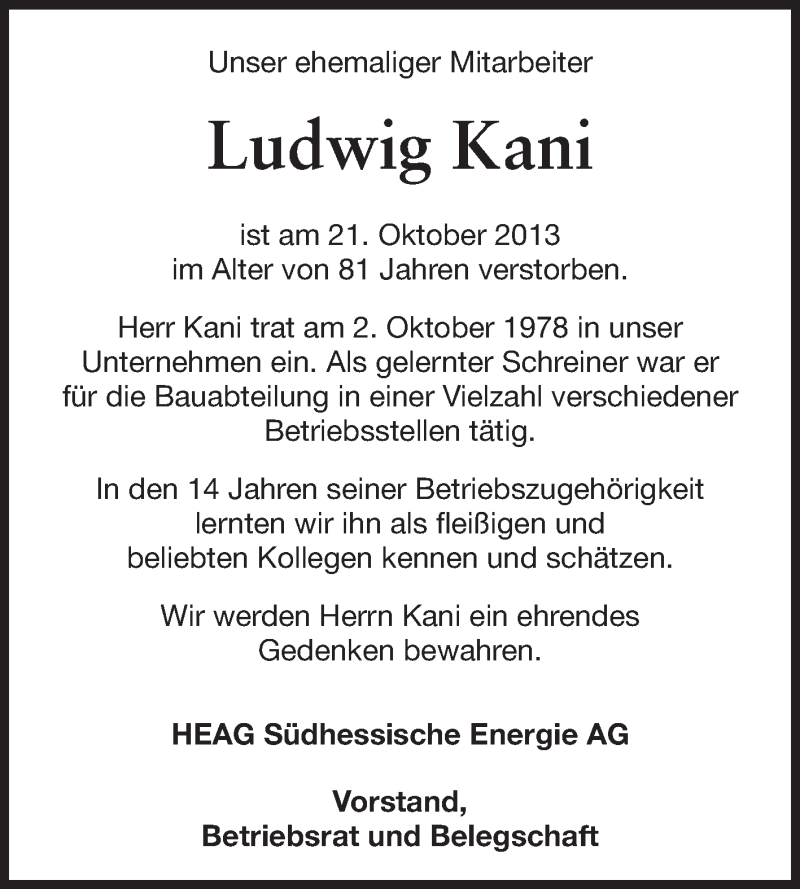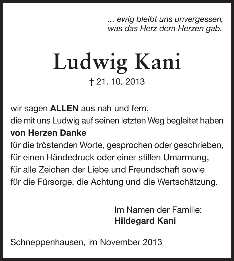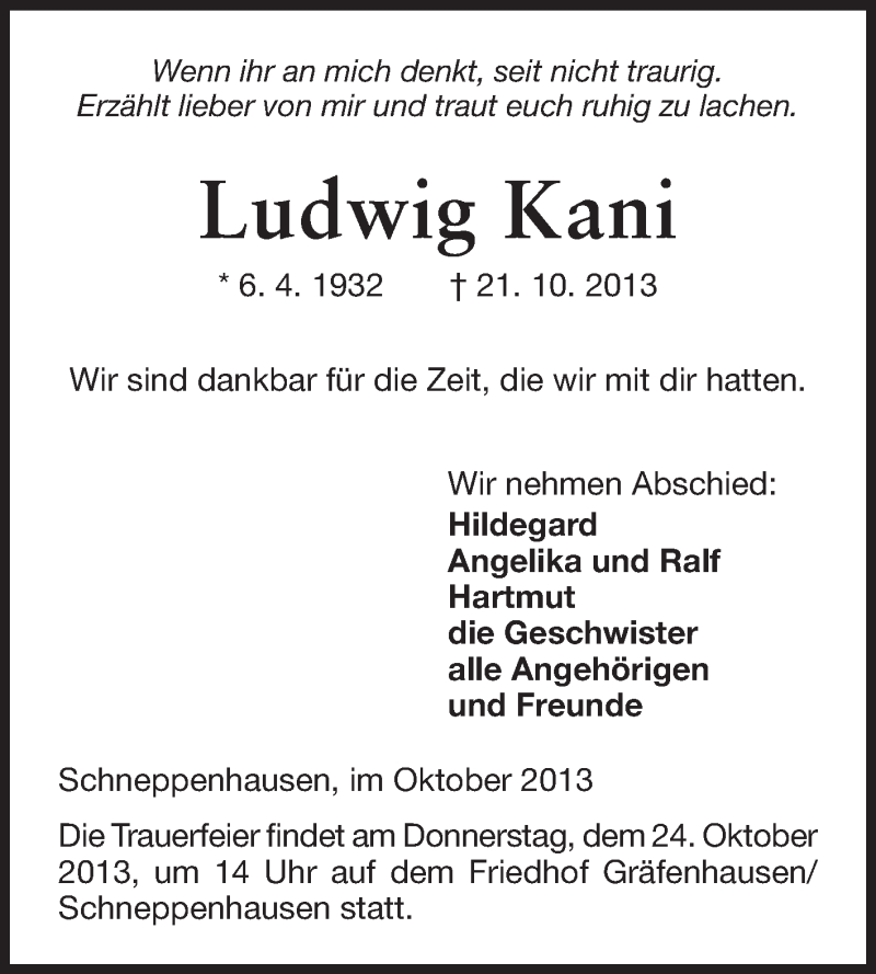 Hier finden Sie alle Traueranzeigen aus der Zeitung, die bisher für Ludwig Kani erschienen sind. Weitere Traueranzeigen, die in der Zeitung erscheinen, werden hier ebenfalls aufgelistet
