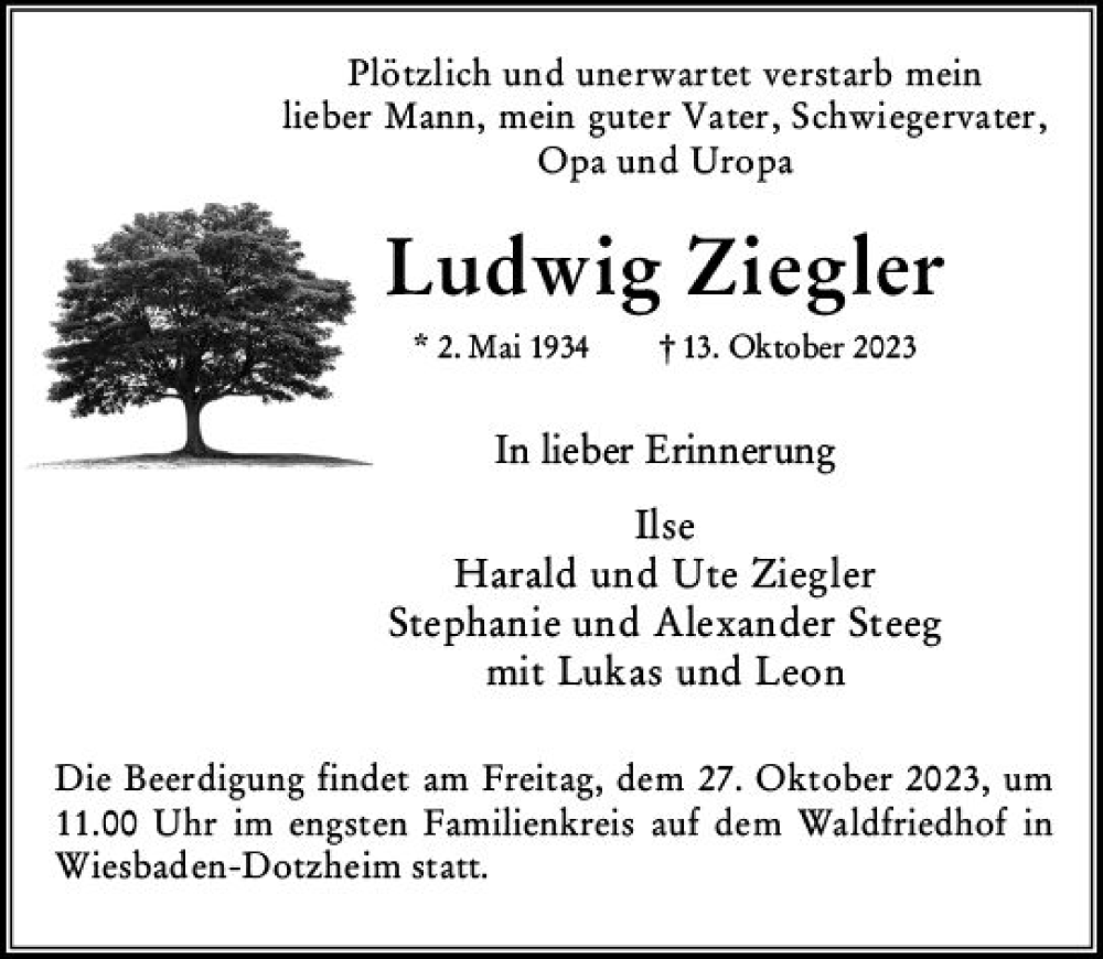 Hier finden Sie alle Traueranzeigen aus der Zeitung, die bisher für Ludwig Ziegler erschienen sind. Weitere Traueranzeigen, die in der Zeitung erscheinen, werden hier ebenfalls aufgelistet