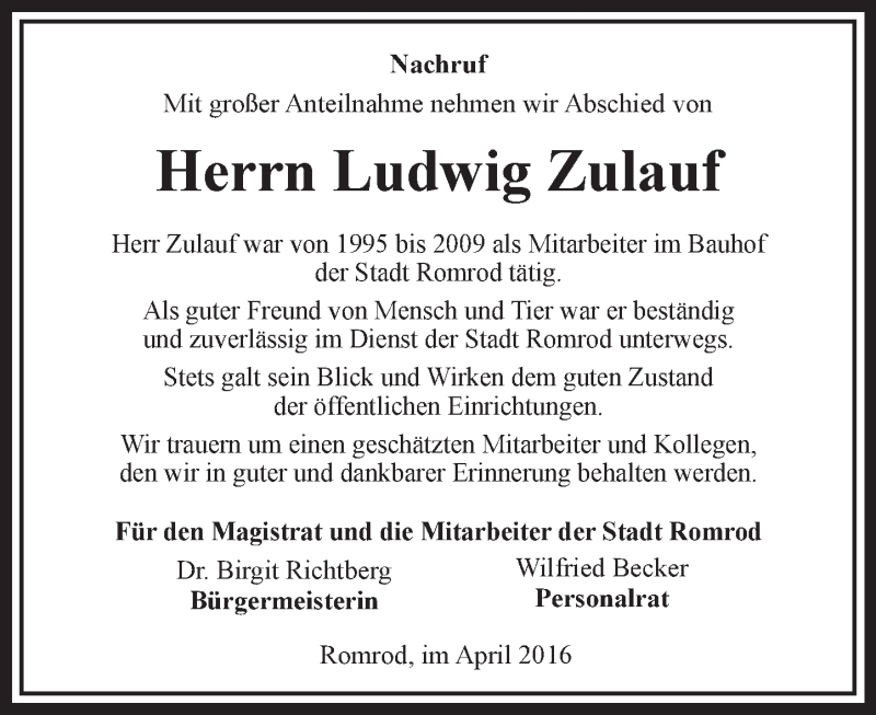 Hier finden Sie alle Traueranzeigen aus der Zeitung, die bisher für Ludwig Zulauf erschienen sind. Weitere Traueranzeigen, die in der Zeitung erscheinen, werden hier ebenfalls aufgelistet