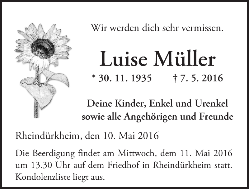 Hier finden Sie alle Traueranzeigen aus der Zeitung, die bisher für Luise Mül-er erschienen sind. Weitere Traueranzeigen, die in der Zeitung erscheinen, werden hier ebenfalls aufgelistet