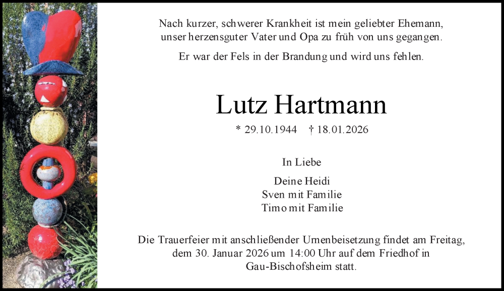 Hier finden Sie alle Traueranzeigen aus der Zeitung, die bisher für Lutz Hartmann erschienen sind. Weitere Traueranzeigen, die in der Zeitung erscheinen, werden hier ebenfalls aufgelistet