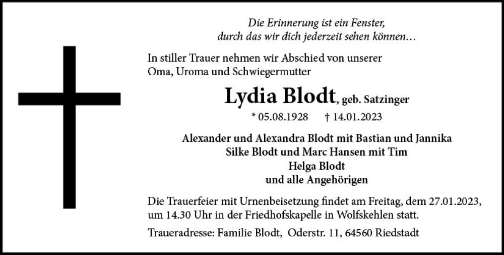 Hier finden Sie alle Traueranzeigen aus der Zeitung, die bisher für Lydia Blodt erschienen sind. Weitere Traueranzeigen, die in der Zeitung erscheinen, werden hier ebenfalls aufgelistet