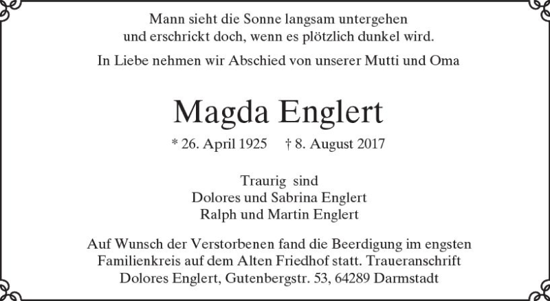 Hier finden Sie alle Traueranzeigen aus der Zeitung, die bisher für Magda Englert erschienen sind. Weitere Traueranzeigen, die in der Zeitung erscheinen, werden hier ebenfalls aufgelistet