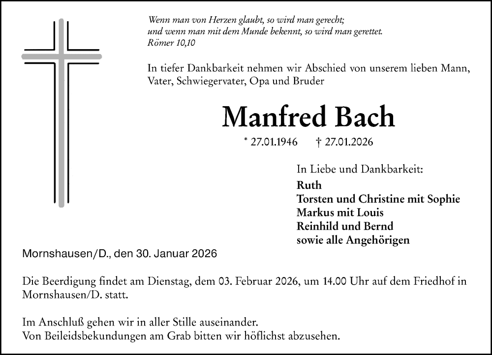 Hier finden Sie alle Traueranzeigen aus der Zeitung, die bisher für Manfred Bach erschienen sind. Weitere Traueranzeigen, die in der Zeitung erscheinen, werden hier ebenfalls aufgelistet