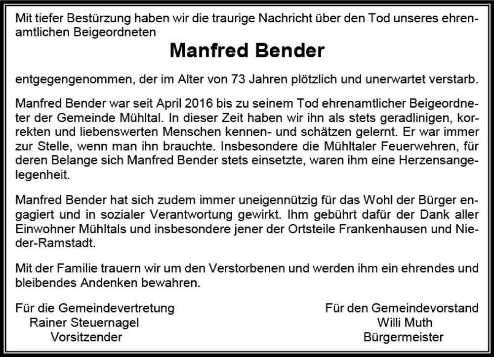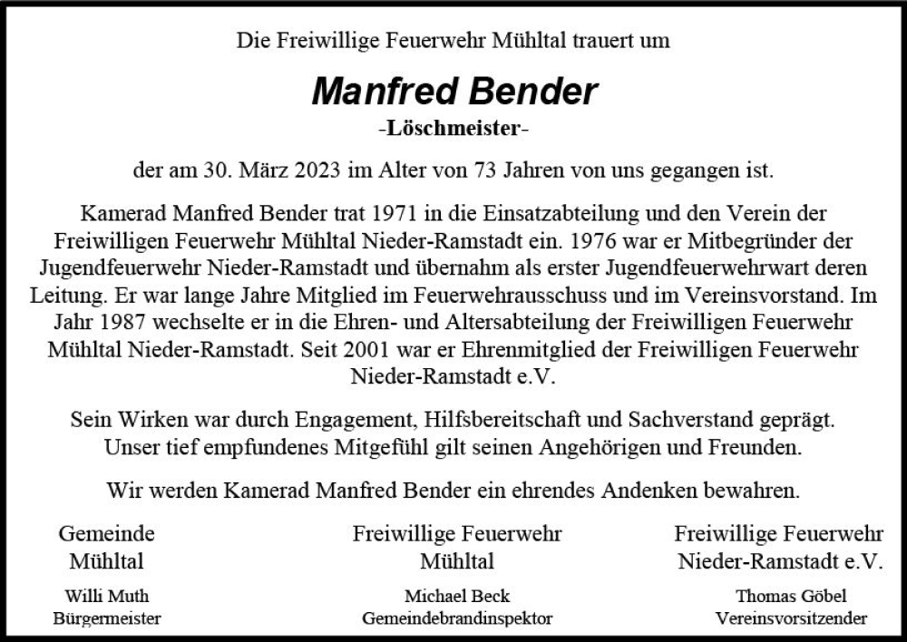 Hier finden Sie alle Traueranzeigen aus der Zeitung, die bisher für Manfred Bender erschienen sind. Weitere Traueranzeigen, die in der Zeitung erscheinen, werden hier ebenfalls aufgelistet