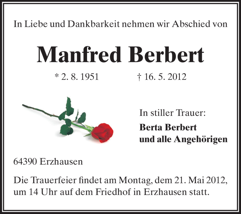 Hier finden Sie alle Traueranzeigen aus der Zeitung, die bisher für Manfred Berbert erschienen sind. Weitere Traueranzeigen, die in der Zeitung erscheinen, werden hier ebenfalls aufgelistet