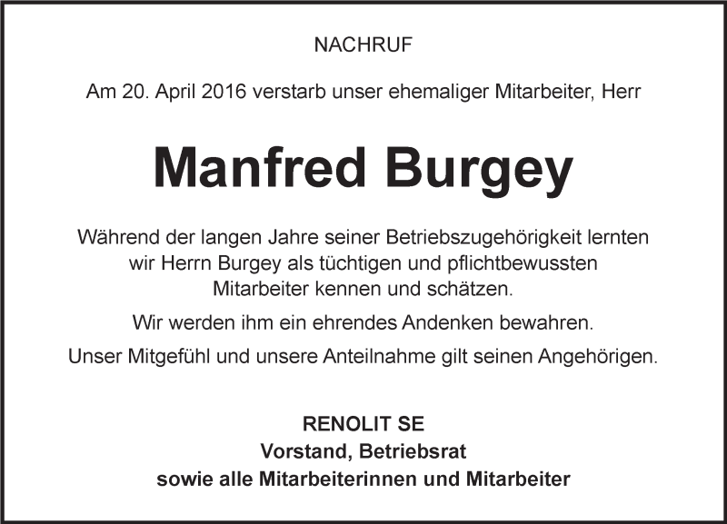Hier finden Sie alle Traueranzeigen aus der Zeitung, die bisher für Manfred Burgey erschienen sind. Weitere Traueranzeigen, die in der Zeitung erscheinen, werden hier ebenfalls aufgelistet