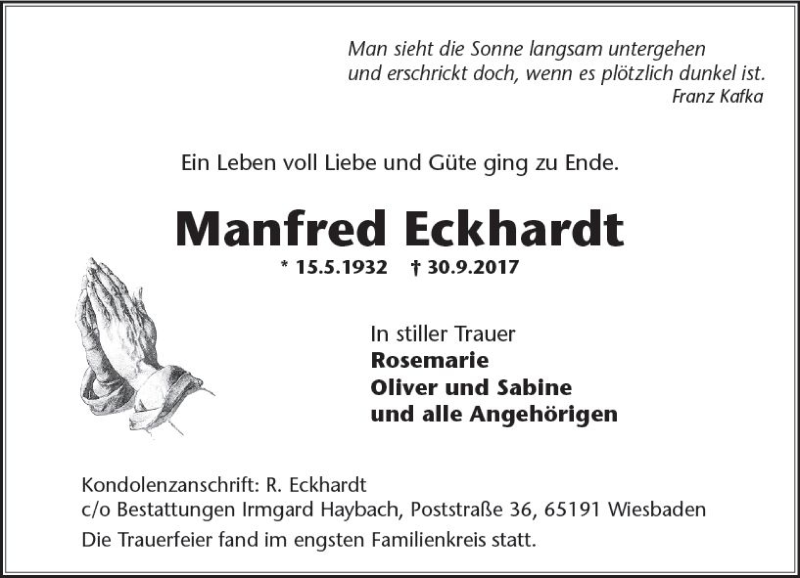 Hier finden Sie alle Traueranzeigen aus der Zeitung, die bisher für Manfred Eckhardt erschienen sind. Weitere Traueranzeigen, die in der Zeitung erscheinen, werden hier ebenfalls aufgelistet