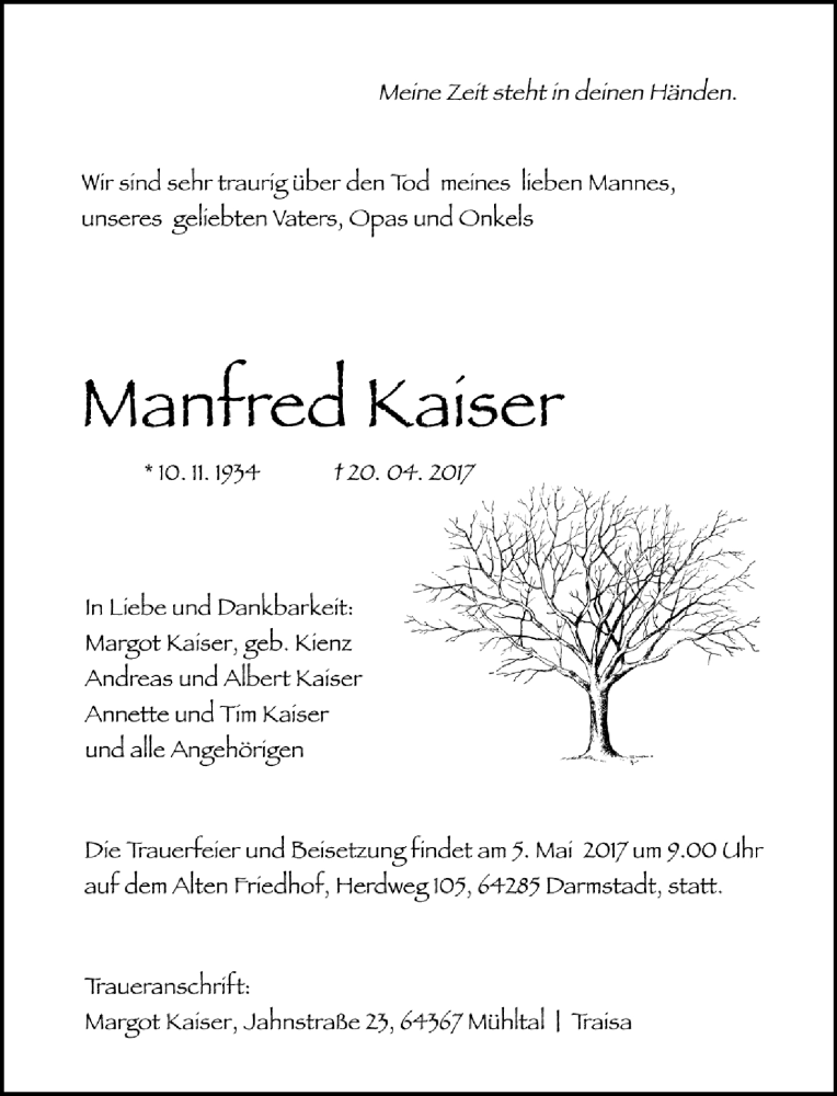 Hier finden Sie alle Traueranzeigen aus der Zeitung, die bisher für Manfred Kaiser erschienen sind. Weitere Traueranzeigen, die in der Zeitung erscheinen, werden hier ebenfalls aufgelistet