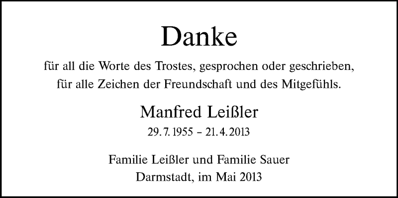 Hier finden Sie alle Traueranzeigen aus der Zeitung, die bisher für Manfred Leißler erschienen sind. Weitere Traueranzeigen, die in der Zeitung erscheinen, werden hier ebenfalls aufgelistet