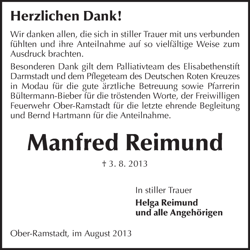 Hier finden Sie alle Traueranzeigen aus der Zeitung, die bisher für Manfred Reimund erschienen sind. Weitere Traueranzeigen, die in der Zeitung erscheinen, werden hier ebenfalls aufgelistet