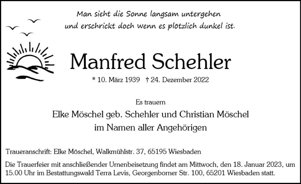 Hier finden Sie alle Traueranzeigen aus der Zeitung, die bisher für Manfred Schehler erschienen sind. Weitere Traueranzeigen, die in der Zeitung erscheinen, werden hier ebenfalls aufgelistet