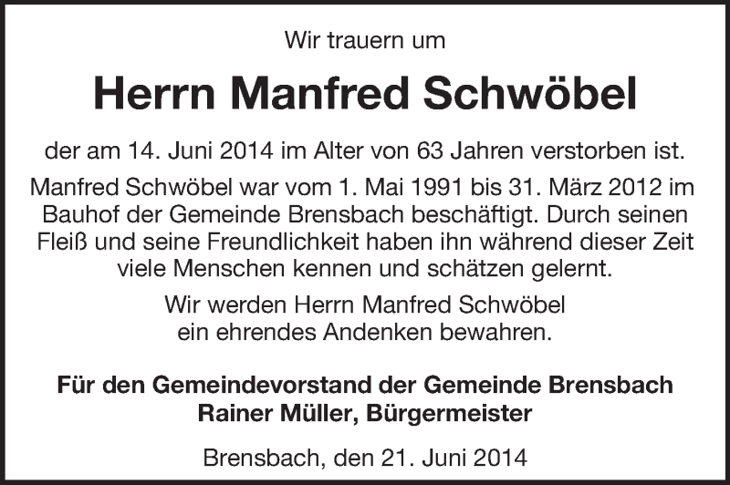 Hier finden Sie alle Traueranzeigen aus der Zeitung, die bisher für Manfred Schwöbel erschienen sind. Weitere Traueranzeigen, die in der Zeitung erscheinen, werden hier ebenfalls aufgelistet