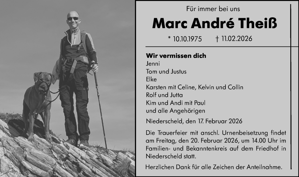 Hier finden Sie alle Traueranzeigen aus der Zeitung, die bisher für Marc André Theiß erschienen sind. Weitere Traueranzeigen, die in der Zeitung erscheinen, werden hier ebenfalls aufgelistet