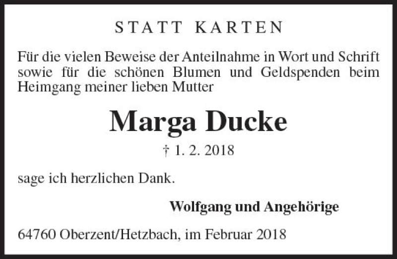Hier finden Sie alle Traueranzeigen aus der Zeitung, die bisher für Marga Ducke erschienen sind. Weitere Traueranzeigen, die in der Zeitung erscheinen, werden hier ebenfalls aufgelistet