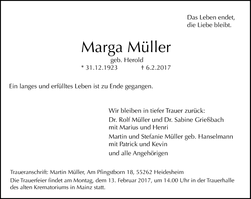 Hier finden Sie alle Traueranzeigen aus der Zeitung, die bisher für Marga Müller erschienen sind. Weitere Traueranzeigen, die in der Zeitung erscheinen, werden hier ebenfalls aufgelistet