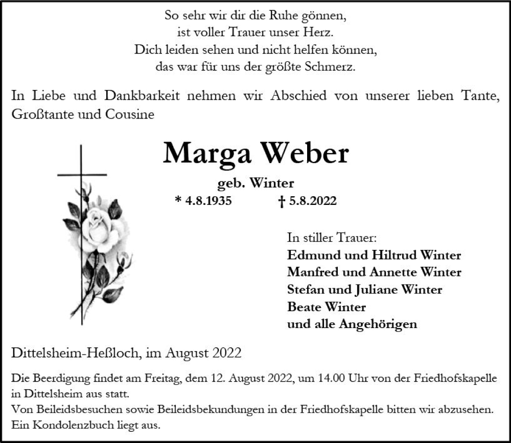 Hier finden Sie alle Traueranzeigen aus der Zeitung, die bisher für Marga Weber erschienen sind. Weitere Traueranzeigen, die in der Zeitung erscheinen, werden hier ebenfalls aufgelistet