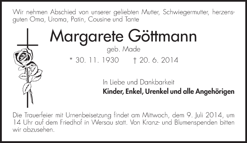 Hier finden Sie alle Traueranzeigen aus der Zeitung, die bisher für Margarete Göttmann erschienen sind. Weitere Traueranzeigen, die in der Zeitung erscheinen, werden hier ebenfalls aufgelistet
