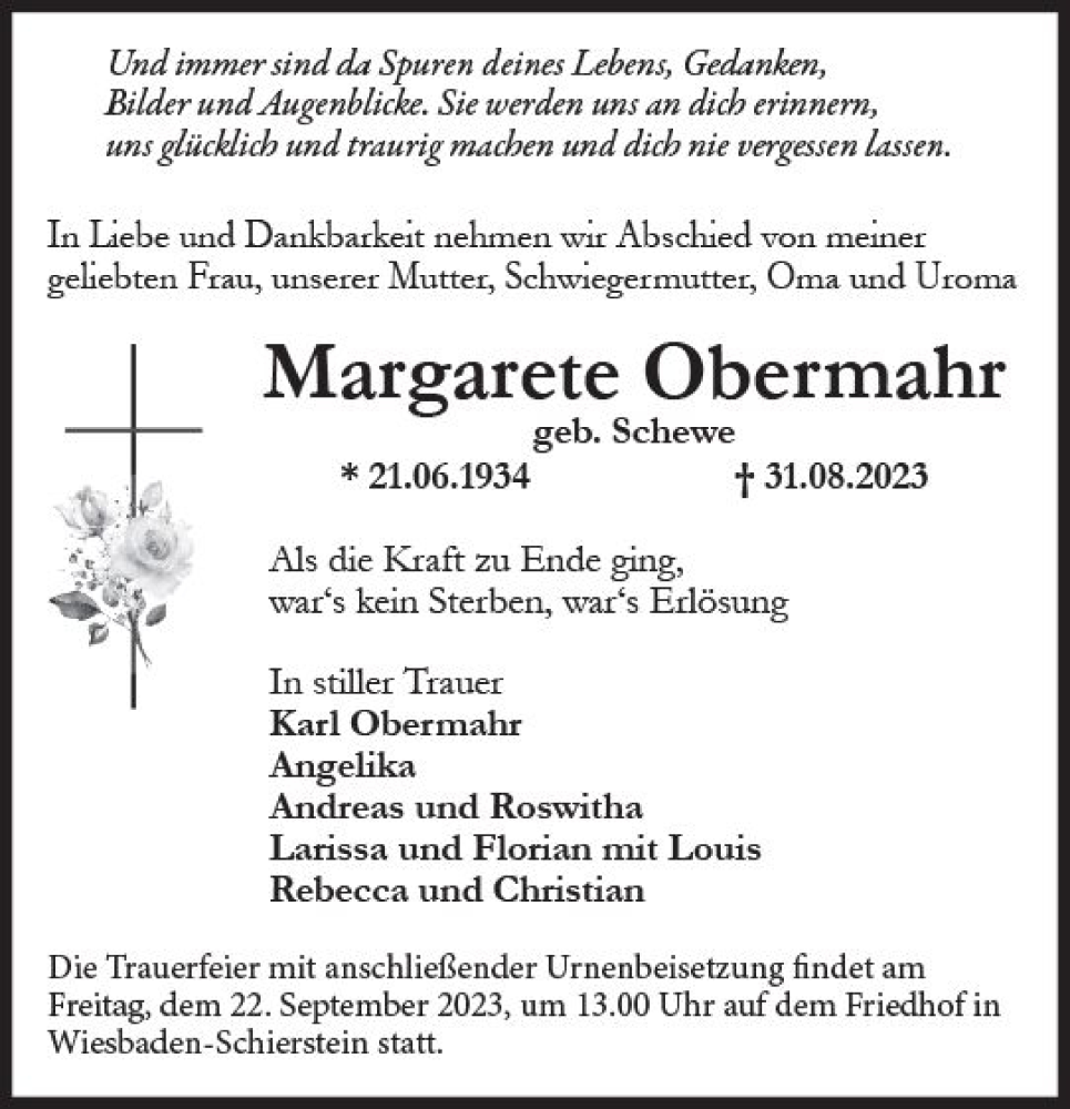 Hier finden Sie alle Traueranzeigen aus der Zeitung, die bisher für Margarete Obermahr erschienen sind. Weitere Traueranzeigen, die in der Zeitung erscheinen, werden hier ebenfalls aufgelistet