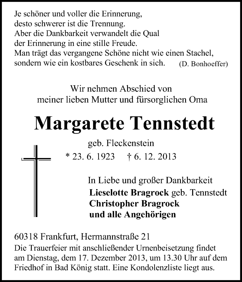 Hier finden Sie alle Traueranzeigen aus der Zeitung, die bisher für Margarete Tennstedt erschienen sind. Weitere Traueranzeigen, die in der Zeitung erscheinen, werden hier ebenfalls aufgelistet