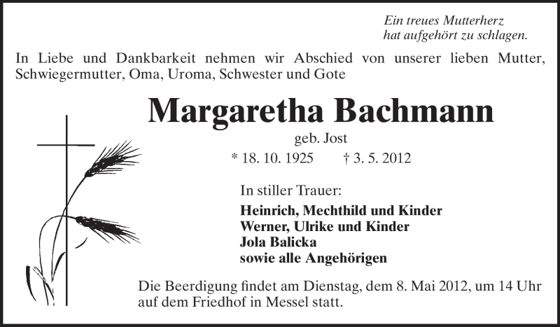 Hier finden Sie alle Traueranzeigen aus der Zeitung, die bisher für Margaretha Bachmann erschienen sind. Weitere Traueranzeigen, die in der Zeitung erscheinen, werden hier ebenfalls aufgelistet