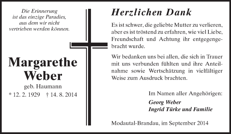 Hier finden Sie alle Traueranzeigen aus der Zeitung, die bisher für Margarethe Weber erschienen sind. Weitere Traueranzeigen, die in der Zeitung erscheinen, werden hier ebenfalls aufgelistet