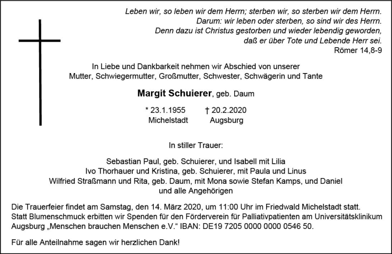 Hier finden Sie alle Traueranzeigen aus der Zeitung, die bisher für Margit Schuierer erschienen sind. Weitere Traueranzeigen, die in der Zeitung erscheinen, werden hier ebenfalls aufgelistet