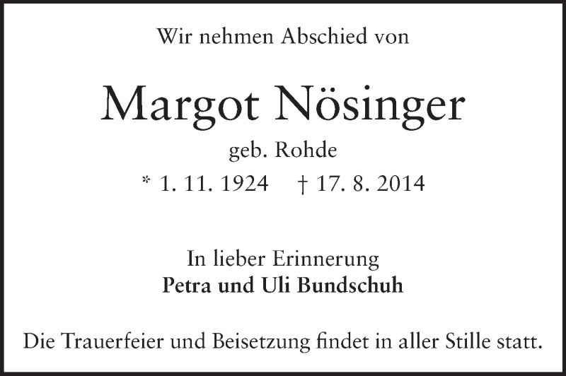 Hier finden Sie alle Traueranzeigen aus der Zeitung, die bisher für Margot Nösinger erschienen sind. Weitere Traueranzeigen, die in der Zeitung erscheinen, werden hier ebenfalls aufgelistet