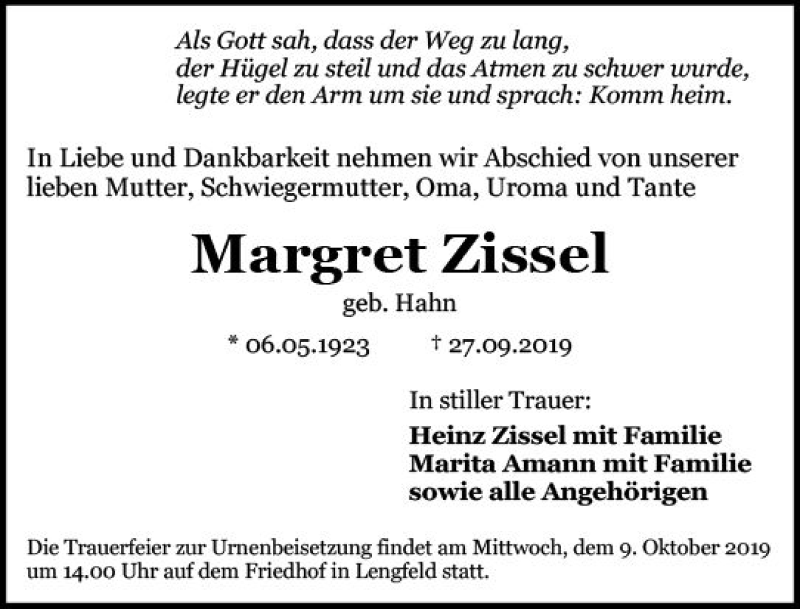 Hier finden Sie alle Traueranzeigen aus der Zeitung, die bisher für Margret Zissel erschienen sind. Weitere Traueranzeigen, die in der Zeitung erscheinen, werden hier ebenfalls aufgelistet