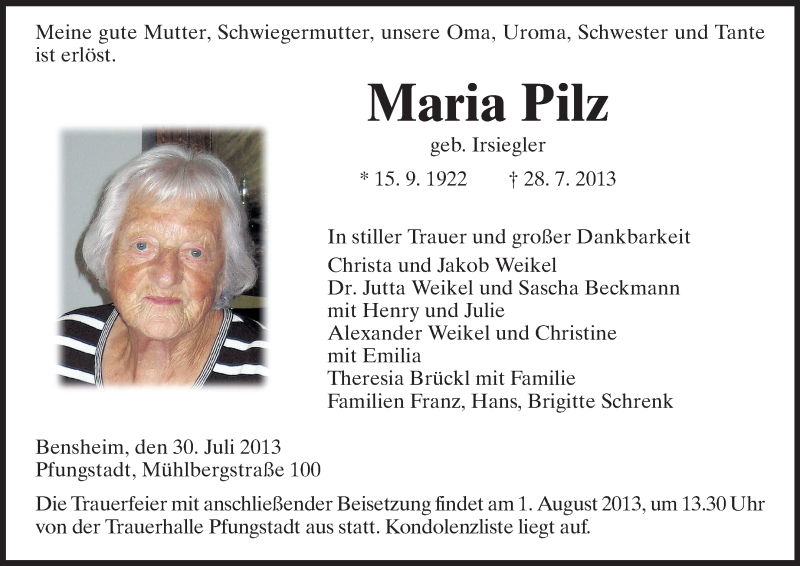 Hier finden Sie alle Traueranzeigen aus der Zeitung, die bisher für Maria Pilz erschienen sind. Weitere Traueranzeigen, die in der Zeitung erscheinen, werden hier ebenfalls aufgelistet