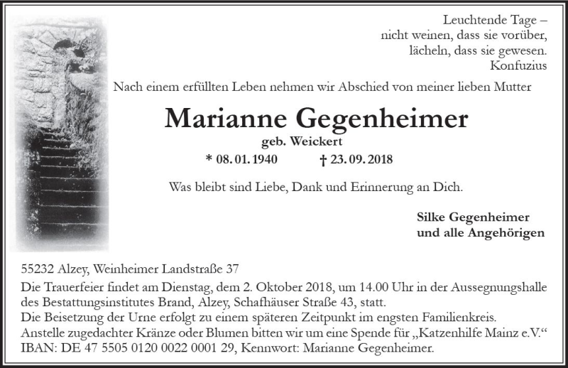 Hier finden Sie alle Traueranzeigen aus der Zeitung, die bisher für Marianne Gegenheimer erschienen sind. Weitere Traueranzeigen, die in der Zeitung erscheinen, werden hier ebenfalls aufgelistet