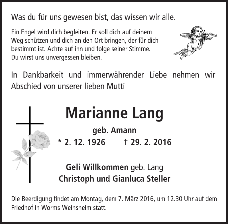 Hier finden Sie alle Traueranzeigen aus der Zeitung, die bisher für Marianne Lang erschienen sind. Weitere Traueranzeigen, die in der Zeitung erscheinen, werden hier ebenfalls aufgelistet