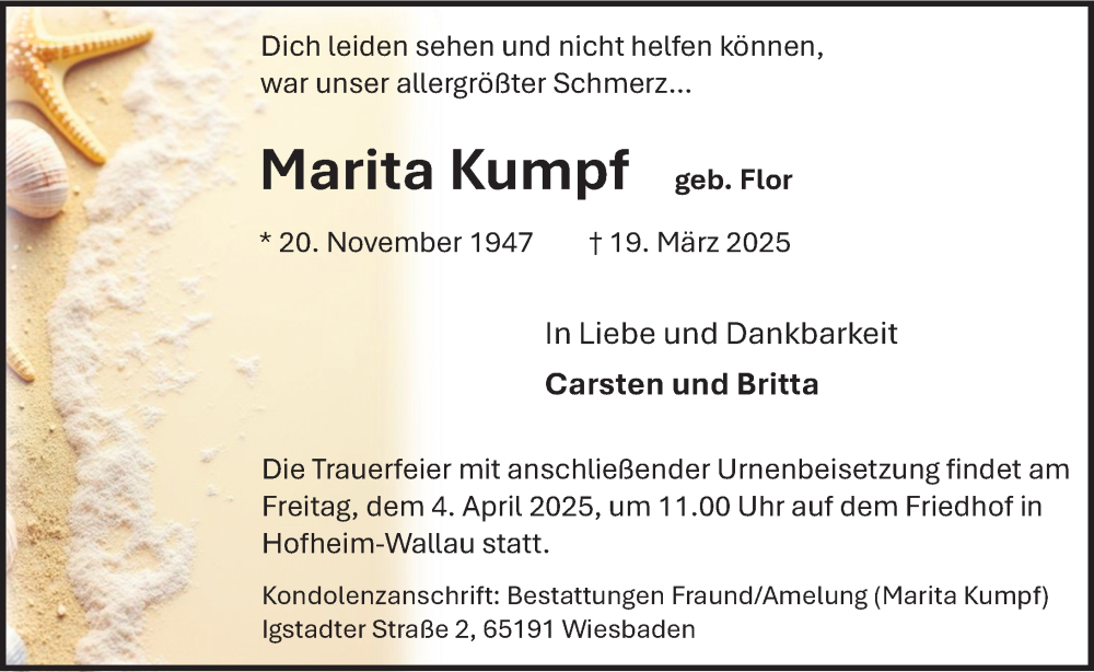 Hier finden Sie alle Traueranzeigen aus der Zeitung, die bisher für Marita Kumpf erschienen sind. Weitere Traueranzeigen, die in der Zeitung erscheinen, werden hier ebenfalls aufgelistet
