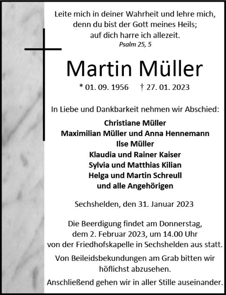 Hier finden Sie alle Traueranzeigen aus der Zeitung, die bisher für Martin Müller erschienen sind. Weitere Traueranzeigen, die in der Zeitung erscheinen, werden hier ebenfalls aufgelistet