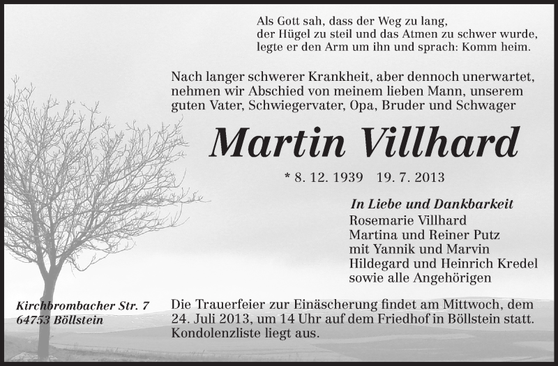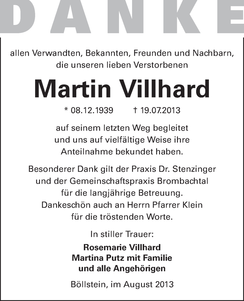 Hier finden Sie alle Traueranzeigen aus der Zeitung, die bisher für Martin Villhard erschienen sind. Weitere Traueranzeigen, die in der Zeitung erscheinen, werden hier ebenfalls aufgelistet