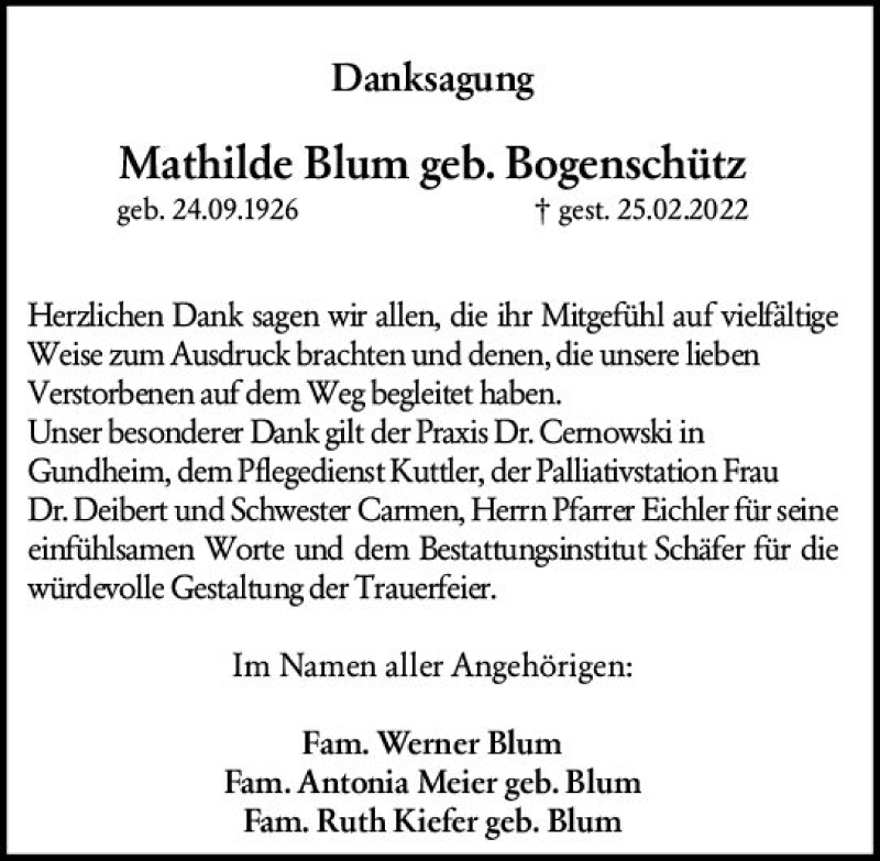 Hier finden Sie alle Traueranzeigen aus der Zeitung, die bisher für Mathilde Blum erschienen sind. Weitere Traueranzeigen, die in der Zeitung erscheinen, werden hier ebenfalls aufgelistet