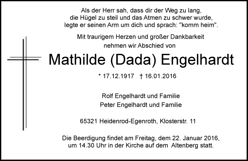 Hier finden Sie alle Traueranzeigen aus der Zeitung, die bisher für Mathilde Engelhardt erschienen sind. Weitere Traueranzeigen, die in der Zeitung erscheinen, werden hier ebenfalls aufgelistet